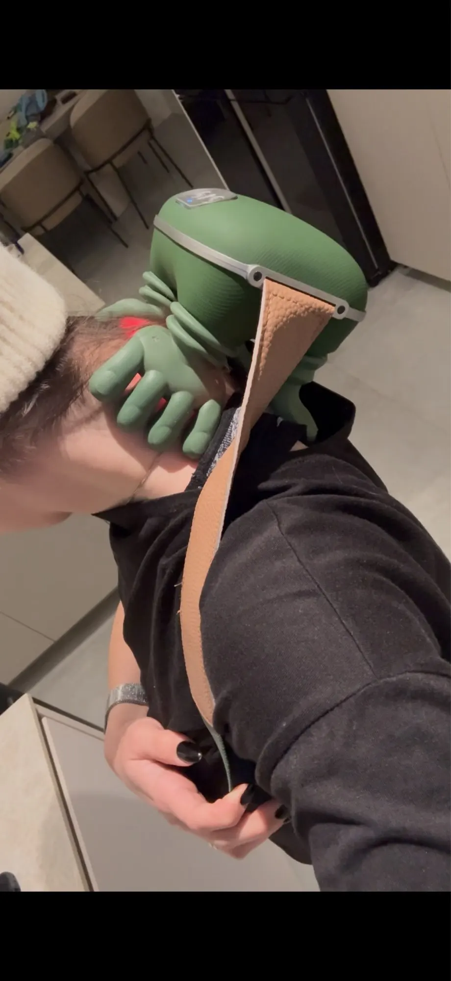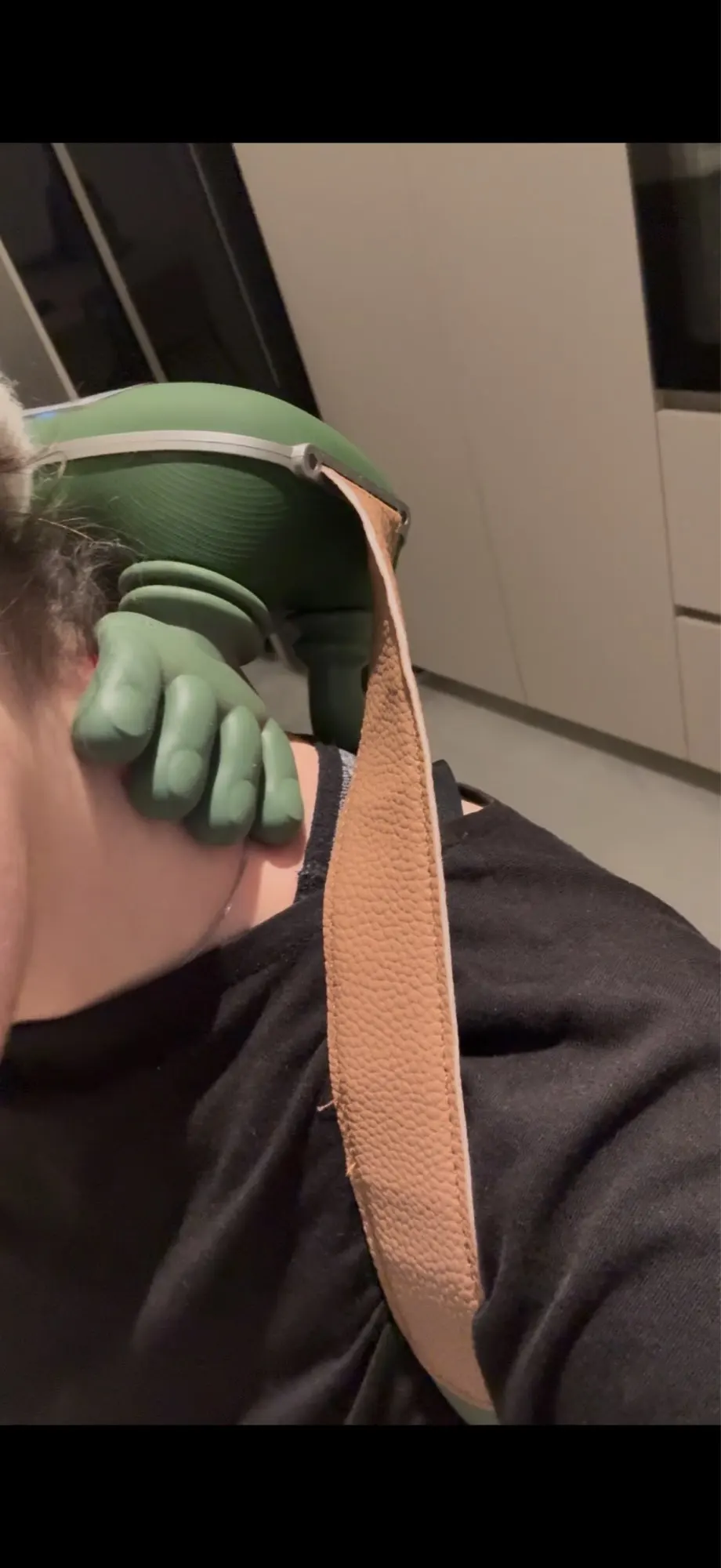 This ergonomic massager is designed to support your neck and head while providing a soothing kneading massage to the shoulders and cervical area. The top part cradles your neck and head, while the beaded section at the bottom targets tension in the shoulders and neck. The central bracket supports the head and neck and can be adjusted to your preferred position. The handle features fixed white sections and blue rotating controls to adjust the strength of the massage balls. Its height is adjustable to suit different users.